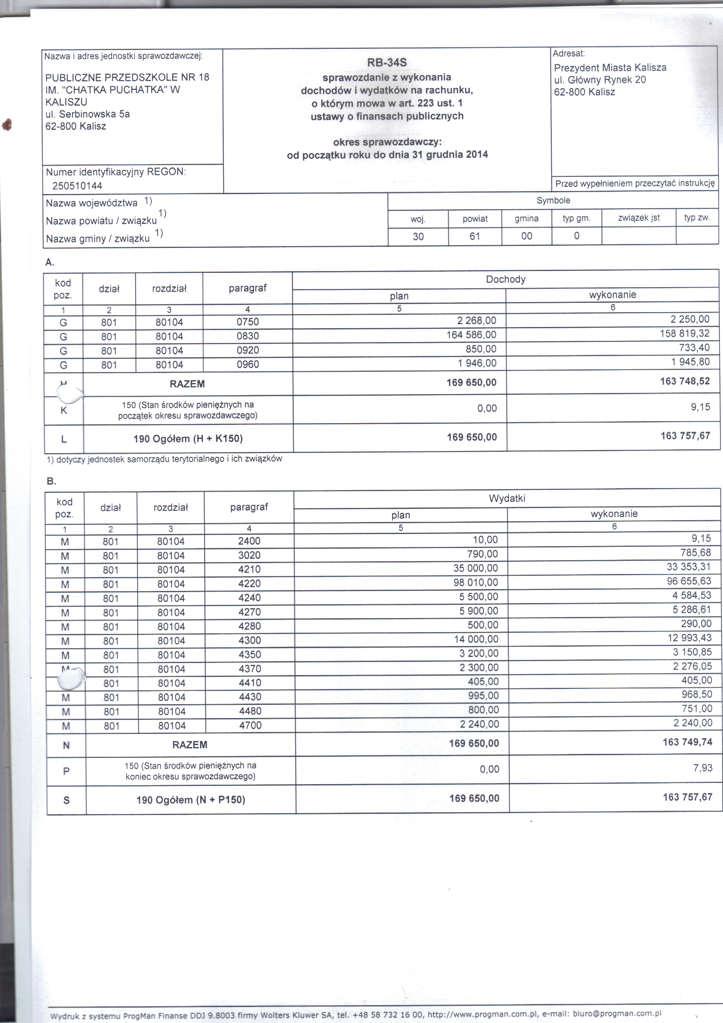 Sprawozdanie Rb- 34S z wykonania dochodów i wydatków na rachunku za 2014rok (część 1)