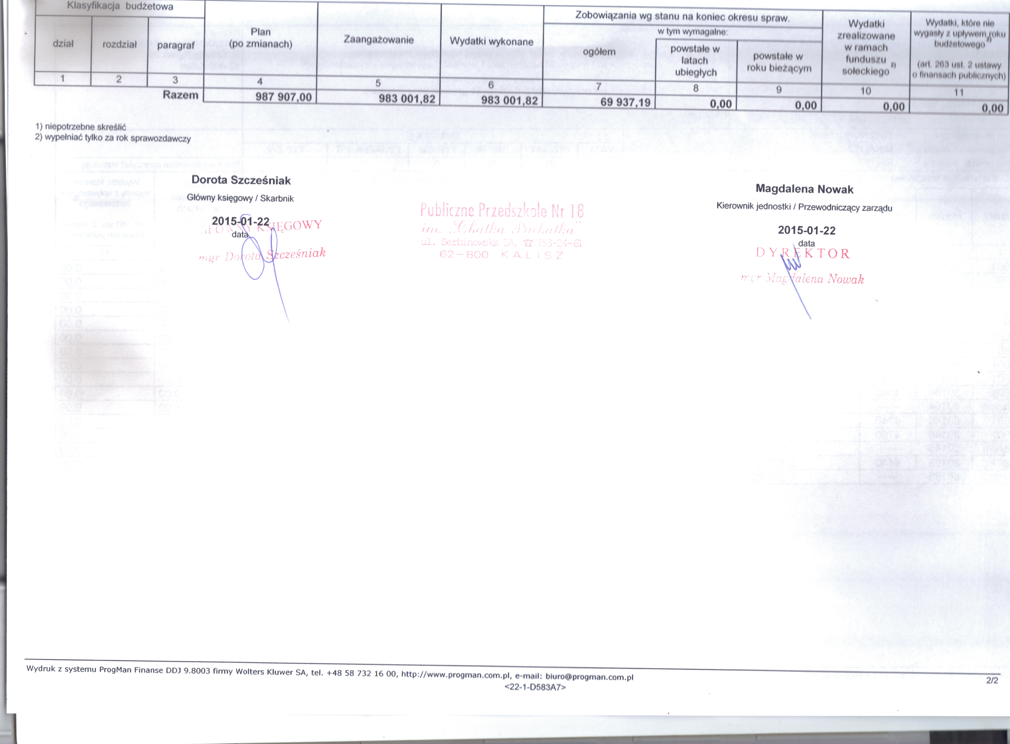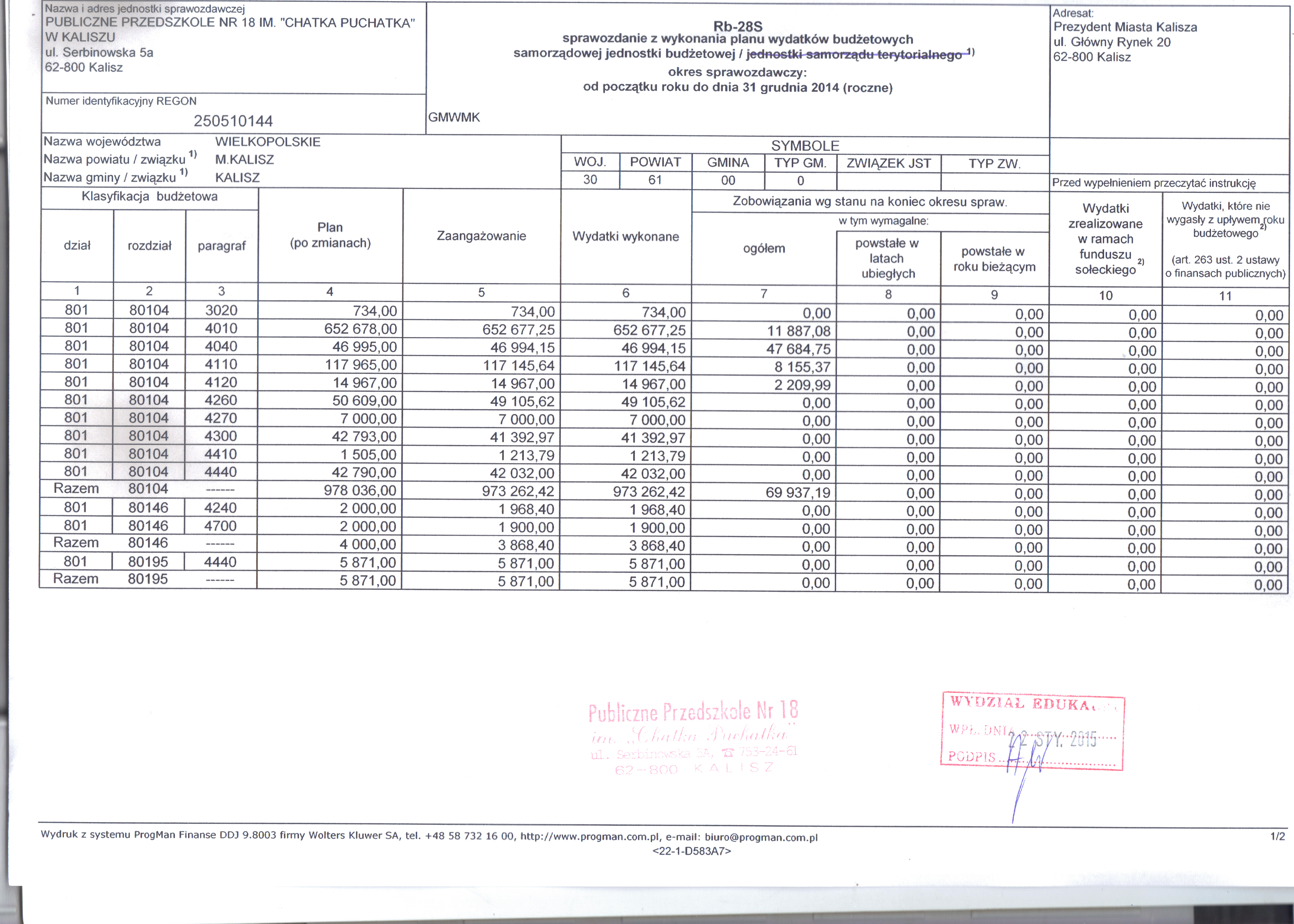 Sprawozdanie Rb- 28S z wykonania planu wydatków budżetowych samorządowej jednostki budżetowej za rok 2014 (część 1)